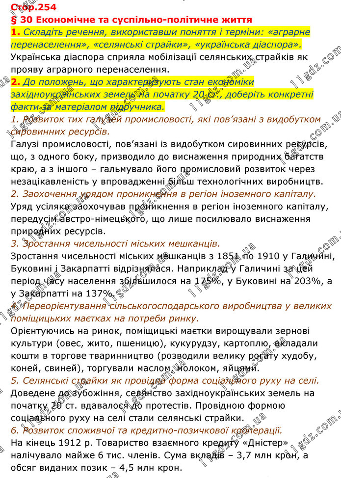 § 30 Економічне та суспільно-політичне життя 1. Складіть речення, використавши поняття і терміни: «аграрне перенаселення», «селянські страйки», «українська діаспора». Українська діаспора сприяла мобілізації селянських страйків як прояву аграрного перенаселення. 2. До положень, що характеризують стан економіки західноукраїнських земель на початку 20 ст., доберіть конкретні факти за матеріалом підручника. 1. Розвиток тих галузей промисловості, які пов’язані з видобутком сировинних ресурсів. Галузі промисловості, пов’язані із видобутком сировинних ресурсів, що, з одного боку, призводило до виснаження природних багатств краю, а з іншого – гальмувало його промисловий розвиток через незацікавленість у впровадженні більш технологічних виробництв. 2. Заохочення урядом проникнення в регіон іноземного капіталу. Уряд усіляко заохочував проникнення в регіон іноземного капіталу, передусім австро-німецького, що лише посилювало виснаження природних ресурсів. 3. Зростання чисельності міських мешканців. Зростання чисельності міських мешканців з 1851 по 1910 у Галичині, Буковині і Закарпатті відрізнялася. Наприклад у Галичині за цей період часу населення збільшилося на 175%, у Буковині на 203%, а у Закарпатті на 137%. 4. Переорієнтування сільськогосподарського виробництва у великих поміщицьких маєтках на потреби ринку. Орієнтуючись на ринок, поміщицькі маєтки вирощували зернові культури (овес, жито, пшеницю), кукурудзу, картоплю, вкладали кошти в торгове тваринництво (розводили велику рогату худобу, коней, свиней), торгували маслом, молоком, яйцями. 5. Селянські страйки як провідна форма соціального руху на селі. Доведене до зубожіння, селянство західноукраїнських земель на початку 20 ст. вдавалося до протестів. Провідною формою соціального руху на селі стали селянські страйки. 6. Розвиток споживчої та кредитно-позичкової кооперації. На кінець 1912 р. Товариство взаємного кредиту «Дністер» налічувало майже 6 тис. членів. Сума вкладів – 3,7 млн крон, а обсяг виданих позик – 4,5 млн крон.