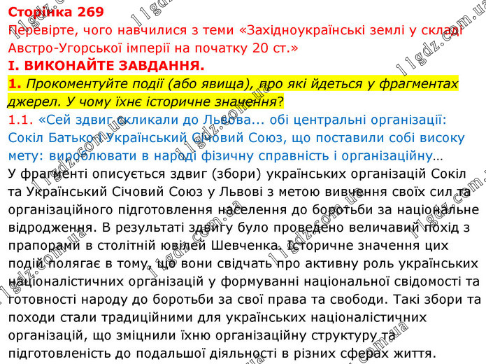 Перевірте, чого навчилися з теми «Західноукраїнські землі у складі Австро-Угорської імперії на початку 20 ст.» І. ВИКОНАЙТЕ ЗАВДАННЯ. 1. Прокоментуйте події (або явища), про які йдеться у фрагментах джерел. У чому їхнє історичне значення? 1.1. «Сей здвиг скликали до Львова... обі центральні організації: Сокіл Батько і Український Січовий Союз, що поставили собі високу мету: вироблювати в народі фізичну справність і організаційну… У фрагменті описується здвиг (збори) українських організацій Сокіл та Український Січовий Союз у Львові з метою вивчення своїх сил та організаційного підготовлення населення до боротьби за національне відродження. В результаті здвигу було проведено величавий похід з прапорами в столітній ювілей Шевченка. Історичне значення цих подій полягає в тому, що вони свідчать про активну роль українських націоналістичних організацій у формуванні національної свідомості та готовності народу до боротьби за свої права та свободи. Такі збори та походи стали традиційними для українських націоналістичних організацій, що зміцнили їхню організаційну структуру та підготовленість до подальшої діяльності в різних сферах життя.