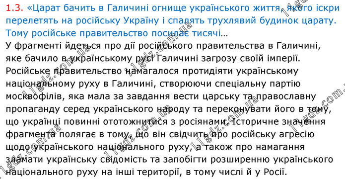 1.3. «Царат бачить в Галичині огнище українського життя, якого іскри перелетять на російську Україну і спалять трухлявий будинок царату. Тому російське правительство посилає тисячі… У фрагменті йдеться про дії російського правительства в Галичині, яке бачило в українському русі Галичині загрозу своїй імперії. Російське правительство намагалося протидіяти українському національному руху в Галичині, створюючи спеціальну партію москвофілів, яка мала за завдання вести царську та православну пропаганду серед українського народу та переконувати його в тому, що українці повинні ототожнитися з росіянами. Історичне значення фрагмента полягає в тому, що він свідчить про російську агресію щодо українського національного руху, а також про намагання зламати українську свідомість та запобігти розширенню українського національного руху на інші території, в тому числі й у Росії.