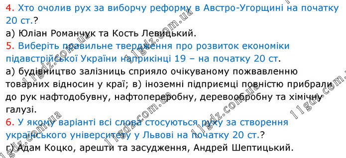 4. Хто очолив рух за виборчу реформу в Австро-Угорщині на початку 20 ст.? а) Юліан Романчук та Кость Левицький. 5. Виберіть правильне твердження про розвиток економіки підавстрійської України наприкінці 19 – на початку 20 ст. а) будівництво залізниць сприяло очікуваному пожвавленню товарних відносин у краї; в) іноземні підприємці повністю прибрали до рук нафтодобувну, нафтопереробну, деревообробну та хімічну галузі. 6. У якому варіанті всі слова стосуються руху за створення українського університету у Львові на початку 20 ст.? г) Адам Коцко, арешти та засудження, Андрей Шептицький.