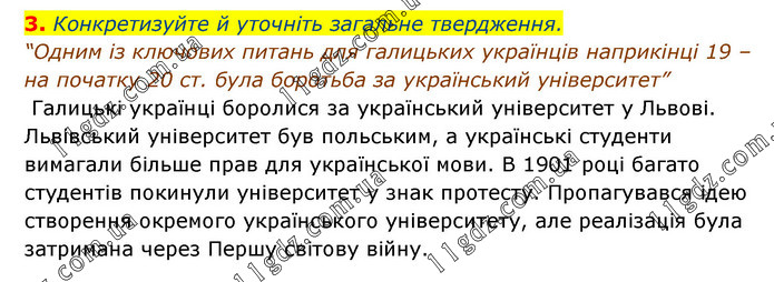 Конкретизуйте й уточніть загальне твердження. “Одним із ключових питань для галицьких українців наприкінці 19 – на початку 20 ст. була боротьба за український університет” Галицькі українці боролися за український університет у Львові. Львівський університет був польським, а українські студенти вимагали більше прав для української мови. В 1901 році багато студентів покинули університет у знак протесту. Пропагувався ідею створення окремого українського університету, але реалізація була затримана через Першу світову війну.