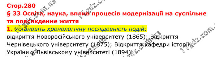§ 33 Освіта, наука, вплив процесів модернізації на суспільне та повсякденне життя 1. Установіть хронологічну послідовність подій: відкриття Новоросійського університету (1865); Відкриття Чернівецького університету (1875); Відкриття кафедри історії України у Львівському університеті (1894).