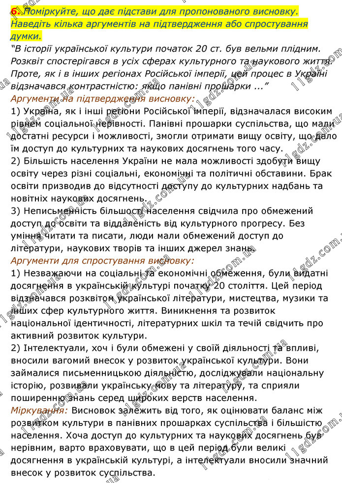 Поміркуйте, що дає підстави для пропонованого висновку. Наведіть кілька аргументів на підтвердження або спростування думки. “В історії української культури початок 20 ст. був вельми плідним. Розквіт спостерігався в усіх сферах культурного та наукового життя. Проте, як і в інших регіонах Російської імперії, цей процес в Україні відзначався контрастністю: якщо панівні прошарки ...” Аргументи на підтвердження висновку: 1) Україна, як і інші регіони Російської імперії, відзначалася високим рівнем соціальної нерівності. Панівні прошарки суспільства, що мали достатні ресурси і можливості, змогли отримати вищу освіту, що дало їм доступ до культурних та наукових досягнень того часу. 2) Більшість населення України не мала можливості здобути вищу освіту через різні соціальні, економічні та політичні обставини. Брак освіти призводив до відсутності доступу до культурних надбань та новітніх наукових досягнень. 3) Неписьменність більшості населення свідчила про обмежений доступ до освіти та віддаленість від культурного прогресу. Без уміння читати та писати, люди мали обмежений доступ до літератури, наукових творів та інших джерел знань. Аргументи для спростування висновку: 1) Незважаючи на соціальні та економічні обмеження, були видатні досягнення в українській культурі початку 20 століття. Цей період відзначався розквітом української літератури, мистецтва, музики та інших сфер культурного життя. Виникнення та розвиток національної ідентичності, літературних шкіл та течій свідчить про активний розвиток культури. 2) Інтелектуали, хоч і були обмежені у своїй діяльності та впливі, вносили вагомий внесок у розвиток української культури. Вони займалися письменницькою діяльністю, досліджували національну історію, розвивали українську мову та літературу, та сприяли поширенню знань серед широких верств населення. Міркування: Висновок залежить від того, як оцінювати баланс між розвитком культури в панівних прошарках суспільства і більшістю населення. Хоча доступ до культурних та наукових досягнень був нерівним, варто враховувати, що в цей період були великі досягнення в українській культурі, а інтелектуали вносили значний внесок у розвиток суспільства.