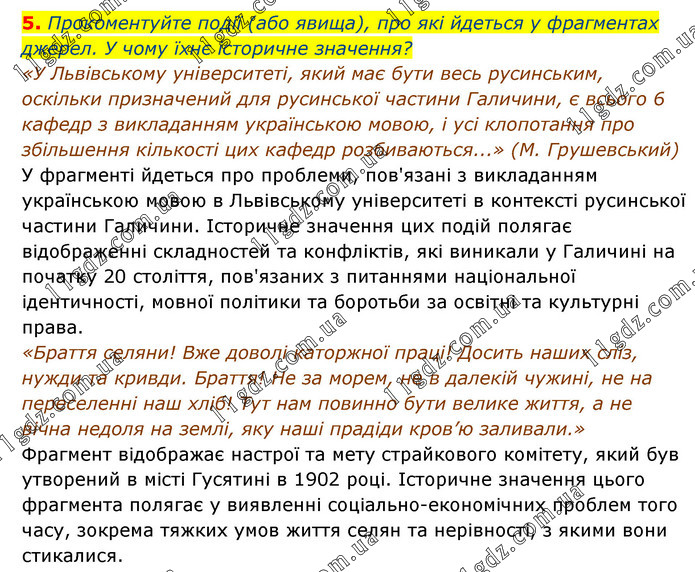 Прокоментуйте події (або явища), про які йдеться у фрагментах джерел. У чому їхнє історичне значення? «У Львівському університеті, який має бути весь русинським, оскільки призначений для русинської частини Галичини, є всього 6 кафедр з викладанням українською мовою, і усі клопотання про збільшення кількості цих кафедр розбиваються...» (М. Грушевський) У фрагменті йдеться про проблеми, пов'язані з викладанням українською мовою в Львівському університеті в контексті русинської частини Галичини. Історичне значення цих подій полягає відображенні складностей та конфліктів, які виникали у Галичині на початку 20 століття, пов'язаних з питаннями національної ідентичності, мовної політики та боротьби за освітні та культурні права. «Браття селяни! Вже доволі каторжної праці! Досить наших сліз, нужди та кривди. Браття! Не за морем, не в далекій чужині, не на переселенні наш хліб! Тут нам повинно бути велике життя, а не вічна недоля на землі, яку наші прадіди кров’ю заливали.» Фрагмент відображає настрої та мету страйкового комітету, який був утворений в місті Гусятині в 1902 році. Історичне значення цього фрагмента полягає у виявленні соціально-економічних проблем того часу, зокрема тяжких умов життя селян та нерівності, з якими вони стикалися.