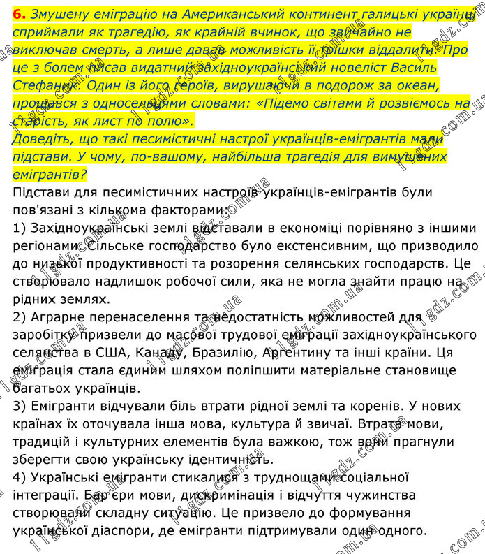 Змушену еміграцію на Американський континент галицькі українці сприймали як трагедію, як крайній вчинок, що звичайно не виключав смерть, а лише давав можливість її трішки віддалити. Про це з болем писав видатний західноукраїнський новеліст Василь Стефаник. Один із його героїв, вирушаючи в подорож за океан, прощався з односельцями словами: «Підемо світами й розвіємось на старість, як лист по полю». Доведіть, що такі песимістичні настрої українців-емігрантів мали підстави. У чому, по-вашому, найбільша трагедія для вимушених емігрантів? Підстави для песимістичних настроїв українців-емігрантів були пов'язані з кількома факторами: 1) Західноукраїнські землі відставали в економіці порівняно з іншими регіонами. Сільське господарство було екстенсивним, що призводило до низької продуктивності та розорення селянських господарств. Це створювало надлишок робочої сили, яка не могла знайти працю на рідних землях. 2) Аграрне перенаселення та недостатність можливостей для заробітку призвели до масової трудової еміграції західноукраїнського селянства в США, Канаду, Бразилію, Аргентину та інші країни. Ця еміграція стала єдиним шляхом поліпшити матеріальне становище багатьох українців. 3) Емігранти відчували біль втрати рідної землі та коренів. У нових країнах їх оточувала інша мова, культура й звичаї. Втрата мови, традицій і культурних елементів була важкою, тож вони прагнули зберегти свою українську ідентичність. 4) Українські емігранти стикалися з труднощами соціальної інтеграції. Бар'єри мови, дискримінація і відчуття чужинства створювали складну ситуацію. Це призвело до формування української діаспори, де емігранти підтримували один одного.