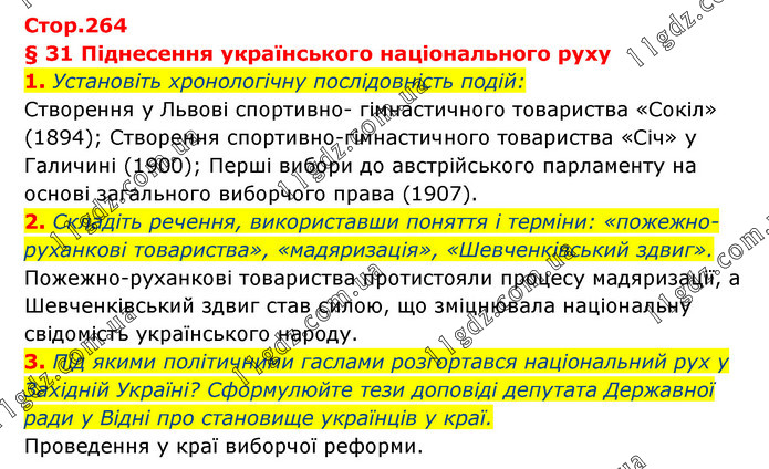 § 31 Піднесення українського національного руху 1. Установіть хронологічну послідовність подій: Створення у Львові спортивно- гімнастичного товариства «Сокіл» (1894); Створення спортивно-гімнастичного товариства «Січ» у Галичині (1900); Перші вибори до австрійського парламенту на основі загального виборчого права (1907). 2. Складіть речення, використавши поняття і терміни: «пожежно-руханкові товариства», «мадяризація», «Шевченківський здвиг». Пожежно-руханкові товариства протистояли процесу мадяризації, а Шевченківський здвиг став силою, що зміцнювала національну свідомість українського народу. 3. Під якими політичними гаслами розгортався національний рух у Західній Україні? Сформулюйте тези доповіді депутата Державної ради у Відні про становище українців у краї. Проведення у краї виборчої реформи.