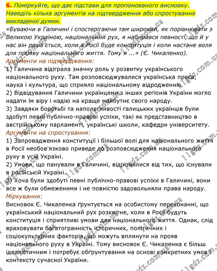Поміркуйте, що дає підстави для пропонованого висновку. Наведіть кілька аргументів на підтвердження або спростування викладеної думки. «Буваючи в Галичині і спостерігаючи там широкий, як порівнювати з Великою Україною, національний рух, я набирався певності, що й у нас він розів’ється, коли в Росії буде конституція і коли настане воля для прояву національного життя. Тому я ...» (Є. Чикаленко). Аргументи на підтвердження: 1) Галичина відіграла значну роль у розвитку українського національного руху. Там розповсюджувалися українська преса, наука і культура, що сприяло національному відродженню. 2) Відвідування Галичини українцями з інших регіонів України могло надати їм віру і надію на краще майбутнє свого народу. 3) Завдяки боротьбі та наполегливості галицьких українців були здобуті певні публічно-правові успіхи, такі як представництво в австрійському парламенті, українські школи, кафедри університету. Аргументи на спростування: 1) Запровадження конституції і більшої волі для національного життя в Росії необов'язково приведе до розповсюдження національного руху в усій Україні. 2) Умови, що панували в Галичині, відрізнялися від тих, що існували в російській Україні. 3) Хоча були здобуті певні публічно-правові успіхи в Галичині, вони все ж були обмеженими і не повністю задовольняли права народу. Міркування: Висновок Є. Чикаленка ґрунтується на особистому переконанні, що український національний рух розквітне, коли в Росії будуть конституція і сприятливі умови для національного життя. Однак, слід враховувати багатогранність історичних, політичних і соціокультурних факторів, що можуть вплинути на прояв національного руху в Україні. Тому висновок Є. Чикаленка є більш ідеалістичним і потребує обґрунтування на основі конкретних умов і контексту сучасної України.