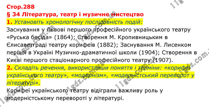 § 34 Література, театр і музичне мистецтво 1. Установіть хронологічну послідовність подій: Заснування у Львові першого професійного українського театру «Руська бесіда» (1864); Створення М. Кропивницьким в Єлисаветграді театру корифеїв (1882); Заснування М. Лисенком першої в Україні Музично-драматичної школи (1904); Створення в Києві першого стаціонарного професійного театру (1907). 2. Складіть речення, використавши поняття і терміни: «корифеї українського театру», «модернізм», «модерністський переворот у літературі». Корифеї українського театру відіграли важливу роль у модерністському перевороті у літературі.