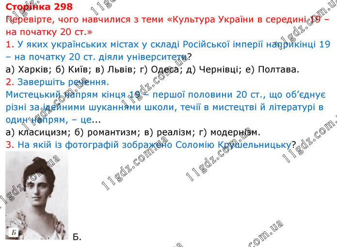 Перевірте, чого навчилися з теми «Культура України в середині 19 – на початку 20 ст.» 1. У яких українських містах у складі Російської імперії наприкінці 19 – на початку 20 ст. діяли університети? а) Харків; б) Київ; в) Львів; г) Одеса; д) Чернівці; е) Полтава. 2. Завершіть речення. Мистецький напрям кінця 19 – першої половини 20 ст., що об’єднує різні за ідейними шуканнями школи, течії в мистецтві й літературі в один напрям, – це... а) класицизм; б) романтизм; в) реалізм; г) модернізм. 3. На якій із фотографій зображено Соломію Крушельницьку? Б.