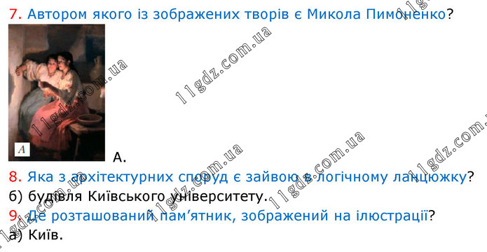 7. Автором якого із зображених творів є Микола Пимоненко? А. 8. Яка з архітектурних споруд є зайвою в логічному ланцюжку? б) будівля Київського університету. 9. Де розташований пам’ятник, зображений на ілюстрації? а) Київ.
