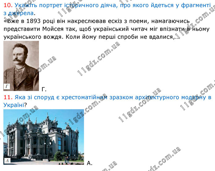 10. Укажіть портрет історичного діяча, про якого йдеться у фрагменті з джерела. «Вже в 1893 році він накреслював ескіз з поеми, намагаючись представити Мойсея так, щоб український читач міг впізнати в ньому українського вождя. Коли йому перші спроби не вдалися,… Г. 11. Яка зі споруд є хрестоматійним зразком архітектурного модерну в Україні? А.