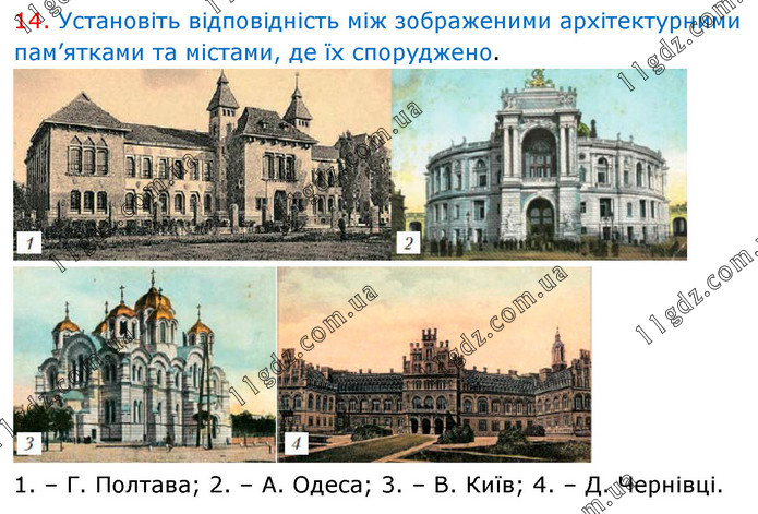 14. Установіть відповідність між зображеними архітектурними пам’ятками та містами, де їх споруджено. 1. – Г. Полтава; 2. – А. Одеса; 3. – В. Київ; 4. – Д. Чернівці.