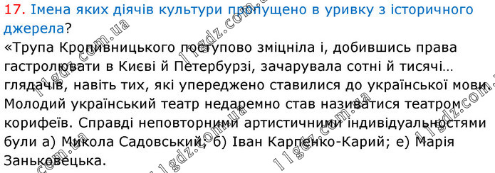 17. Імена яких діячів культури пропущено в уривку з історичного джерела? «Трупа Кропивницького поступово зміцніла і, добившись права гастролювати в Києві й Петербурзі, зачарувала сотні й тисячі… глядачів, навіть тих, які упереджено ставилися до української мови. Молодий український театр недаремно став називатися театром корифеїв. Справді неповторними артистичними індивідуальностями були а) Микола Садовський; б) Іван Карпенко-Карий; е) Марія Заньковецька.
