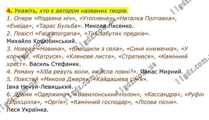 4. Укажіть, хто є автором названих творів. 1. Опери «Різдвяна ніч», «Утоплена», «Наталка Полтавка», «Енеїда», «Тарас Бульба». Микола Лисенко. 2. Повісті «Fata morgana», «Тіні забутих предків». Михайло Коцюбинський. 3. Новели «Новина», «Виводили з села», «Синя книжечка», «У корчмі», «Катруся», «Кленове листя», «Стратився», «Камінний хрест». Василь Стефаник. 4. Роману «Хіба ревуть воли, як ясла повні?». Панас Мирний. 5. Повістей «Микола Джеря», «Кайдашева сім’я». Івна Нечуй-Левицький. 6. Драми «Одержима», «Вавилонський полон», «Кассандра», «Руфін і Прісцілла», «Оргія», «Камінний господар», «Лісова пісня». Леся Українка.