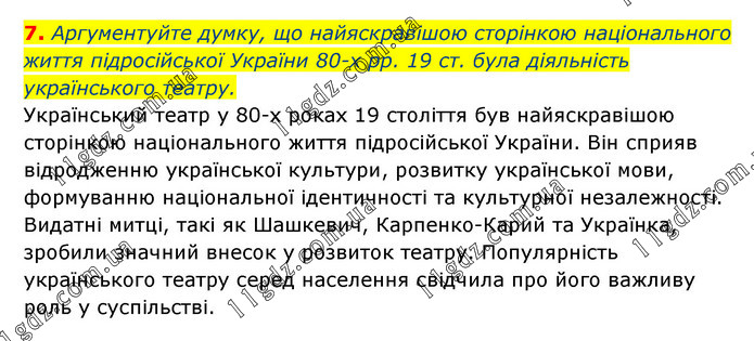 Аргументуйте думку, що найяскравішою сторінкою національного життя підросійської України 80-х рр. 19 ст. була діяльність українського театру. Український театр у 80-х роках 19 століття був найяскравішою сторінкою національного життя підросійської України. Він сприяв відродженню української культури, розвитку української мови, формуванню національної ідентичності та культурної незалежності. Видатні митці, такі як Шашкевич, Карпенко-Карий та Українка, зробили значний внесок у розвиток театру. Популярність українського театру серед населення свідчила про його важливу роль у суспільстві.