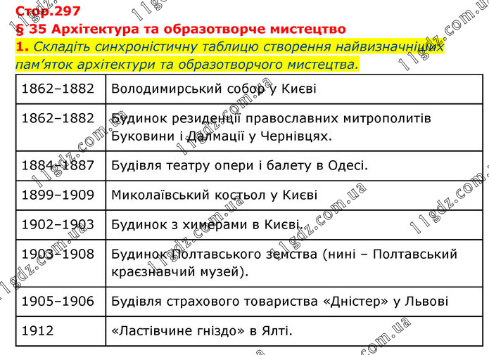 § 35 Архітектура та образотворче мистецтво 1. Складіть синхроністичну таблицю створення найвизначніших пам’яток архітектури та образотворчого мистецтва. 1862–1882 Володимирський собор у Києві 1862–1882 Будинок резиденції православних митрополитів Буковини і Далмації у Чернівцях. 1884–1887 Будівля театру опери і балету в Одесі. 1899–1909 Миколаївський костьол у Києві 1902–1903 Будинок з химерами в Києві. 1903–1908 Будинок Полтавського земства (нині – Полтавський краєзнавчий музей). 1905–1906 Будівля страхового товариства «Дністер» у Львові 1912 «Ластівчине гніздо» в Ялті.