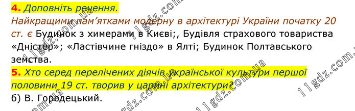4. Доповніть речення. Найкращими пам’ятками модерну в архітектурі України початку 20 ст. є Будинок з химерами в Києві;, Будівля страхового товариства «Дністер»; «Ластівчине гніздо» в Ялті; Будинок Полтавського земства. 5. Хто серед перелічених діячів української культури першої половини 19 ст. творив у царині архітектури? б) В. Городецький.