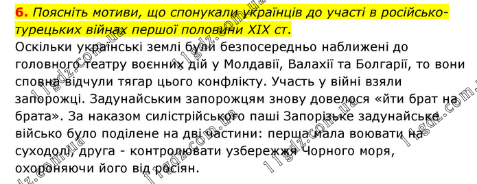 Поясніть мотиви, що спонукали українців до участі в російсько-турецьких війнах першої половини ХІХ ст. Оскільки українські землі були безпосередньо наближені до головного театру воєнних дій у Молдавії, Валахії та Болгарії, то вони сповна відчули тягар цього конфлікту. Участь у війні взяли запорожці. Задунайським запорожцям знову довелося «йти брат на брата». За наказом силістрійського паші Запорізьке задунайське військо було поділене на дві частини: перша мала воювати на суходолі, друга - контролювати узбережжя Чорного моря, охороняючи його від росіян.