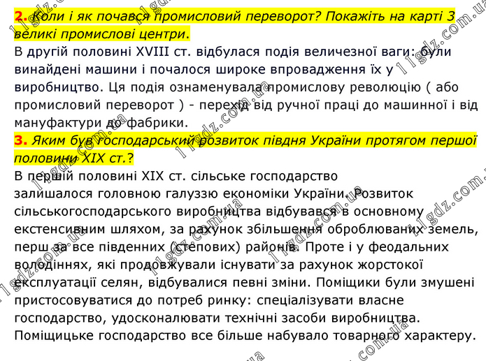 2. Коли і як почався промисловий переворот? Покажіть на карті 3 великі промислові центри. В другій половині ХVІІІ ст. відбулася подія величезної ваги: були винайдені машини і почалося широке впровадження їх у виробництво. Ця подія ознаменувала промислову революцію ( або промисловий переворот ) - перехід від ручної праці до машинної і від мануфактури до фабрики. 3. Яким був господарський розвиток півдня України протягом першої половини XIX ст.? В першій половині XIX ст. сільське господарство залишалося головною галуззю економіки України. Розвиток сільськогосподарського виробництва відбувався в основному екстенсивним шляхом, за рахунок збільшення оброблюваних земель, перш за все південних (степових) районів. Проте і у феодальних володіннях, які продовжували існувати за рахунок жорстокої експлуатації селян, відбувалися певні зміни. Поміщики були змушені пристосовуватися до потреб ринку: спеціалізувати власне господарство, удосконалювати технічні засоби виробництва. Поміщицьке господарство все більше набувало товарного характеру.