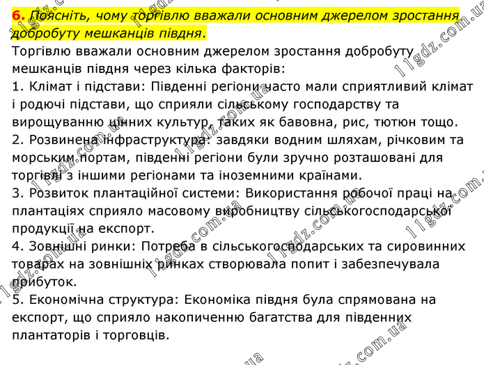 Поясніть, чому торгівлю вважали основним джерелом зростання добробуту мешканців півдня. Торгівлю вважали основним джерелом зростання добробуту мешканців півдня через кілька факторів: 1. Клімат і підстави: Південні регіони часто мали сприятливий клімат і родючі підстави, що сприяли сільському господарству та вирощуванню цінних культур, таких як бавовна, рис, тютюн тощо. 2. Розвинена інфраструктура: завдяки водним шляхам, річковим та морським портам, південні регіони були зручно розташовані для торгівлі з іншими регіонами та іноземними країнами. 3. Розвиток плантаційної системи: Використання робочої праці на плантаціях сприяло масовому виробництву сільськогосподарської продукції на експорт. 4. Зовнішні ринки: Потреба в сільськогосподарських та сировинних товарах на зовнішніх ринках створювала попит і забезпечувала прибуток. 5. Економічна структура: Економіка півдня була спрямована на експорт, що сприяло накопиченню багатства для південних плантаторів і торговців.