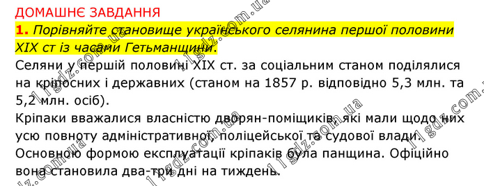 ДОМАШНЄ ЗАВДАННЯ 1. Порівняйте становище українського селянина першої половини ХІХ ст із часами Гетьманщини. Селяни у першій половині XIX ст. за соціальним станом поділялися на кріпосних і державних (станом на 1857 р. відповідно 5,3 млн. та 5,2 млн. осіб). Кріпаки вважалися власністю дворян-поміщиків, які мали щодо них усю повноту адміністративної, поліцейської та судової влади. Основною формою експлуатації кріпаків була панщина. Офіційно вона становила два-три дні на тиждень.