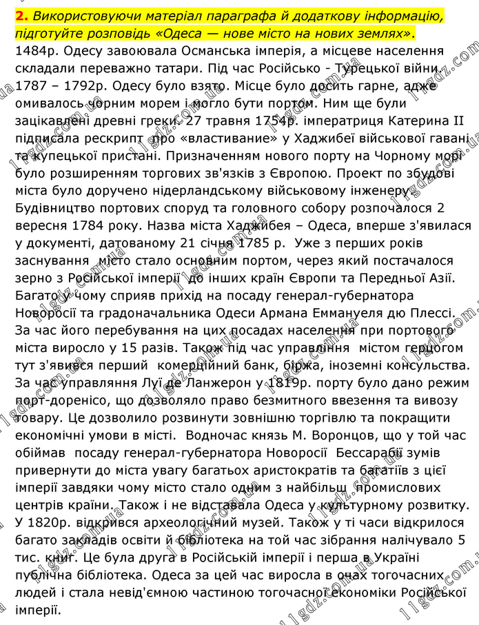 Використовуючи матеріал параграфа й додаткову інформацію, підготуйте розповідь «Одеса — нове місто на нових землях». 1484р. Одесу завоювала Османська імперія, а місцеве населення складали переважно татари. Під час Російсько - Турецької війни. 1787 – 1792р. Одесу було взято. Місце було досить гарне, адже омивалось чорним морем і могло бути портом. Ним ще були зацікавлені древні греки. 27 травня 1754р. імператриця Катерина ІІ підписала рескрипт про «властивание» у Хаджибеї військової гавані та купецької пристані. Призначенням нового порту на Чорному морі було розширенням торгових зв'язків з Європою. Проект по збудові міста було доручено нідерландському військовому інженеру. Будівництво портових споруд та головного собору розпочалося 2 вересня 1784 року. Назва міста Хаджибея – Одеса, вперше з'явилася у документі, датованому 21 січня 1785 р. Уже з перших років заснування місто стало основним портом, через який постачалося зерно з Російської імперії до інших країн Європи та Передньої Азії. Багато у чому сприяв прихід на посаду генерал-губернатора Новоросії та градоначальника Одеси Армана Еммануеля дю Плессі. За час його перебування на цих посадах населення при портового міста виросло у 15 разів. Також під час управління містом герцогом тут з'явився перший комерційний банк, біржа, іноземні консульства. За час управляння Луї де Ланжерон у 1819р. порту було дано режим порт-доренісо, що дозволяло право безмитного ввезення та вивозу товару. Це дозволило розвинути зовнішню торгівлю та покращити економічні умови в місті. Водночас князь М. Воронцов, що у той час обіймав посаду генерал-губернатора Новоросії Бессарабії зумів привернути до міста увагу багатьох аристократів та багатіїв з цієї імперії завдяки чому місто стало одним з найбільш промислових центрів країни. Також і не відставала Одеса у культурному розвитку. У 1820р. відкрився археологічний музей. Також у ті часи відкрилося багато закладів освіти й бібліотека на той час зібрання налічувало 5 тис. книг. Це була друга в Російській імперії і перша в Україні публічна бібліотека. Одеса за цей час виросла в очах тогочасних людей і стала невід'ємною частиною тогочасної економіки Російської імперії.