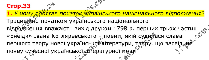 У чому полягав початок українського національного відродження? Традиційно початком українського національного відродження вважають вихід друком 1798 р. перших трьох частин «Енеїди» Івана Котляревського – поеми, якій судилася слава першого твору нової української літератури, твору, що засвідчив появу сучасної української літературної мови.