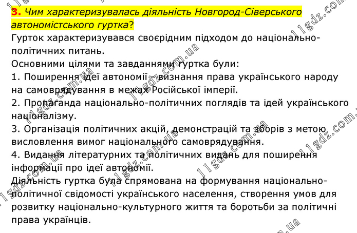 Чим характеризувалась діяльність Новгород-Сіверського автономістського гуртка? Гурток характеризувався своєрідним підходом до національно-політичних питань. Основними цілями та завданнями гуртка були: 1. Поширення ідеї автономії - визнання права українського народу на самоврядування в межах Російської імперії. 2. Пропаганда національно-політичних поглядів та ідей українського націоналізму. 3. Організація політичних акцій, демонстрацій та зборів з метою висловлення вимог національного самоврядування. 4. Видання літературних та політичних видань для поширення інформації про ідеї автономії. Діяльність гуртка була спрямована на формування національно-політичної свідомості українського населення, створення умов для розвитку національно-культурного життя та боротьби за політичні права українців.