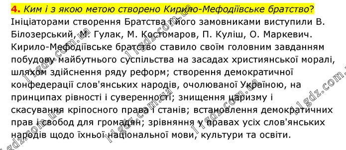 Ким і з якою метою створено Кирило-Мефодіївське братство? Ініціаторами створення Братства і його замовниками виступили В. Білозерський, М. Гулак, М. Костомаров, П. Куліш, О. Маркевич. Кирило-Мефодіївське братство ставило своїм головним завданням побудову майбутнього суспільства на засадах християнської моралі, шляхом здійснення ряду реформ; створення демократичної конфедерації слов'янських народів, очолюваної Україною, на принципах рівності і суверенності; знищення царизму і скасування кріпосного права і станів; встановлення демократичних прав і свобод для громадян; зрівняння у правах усіх слов'янських народів щодо їхньої національної мови, культури та освіти.
