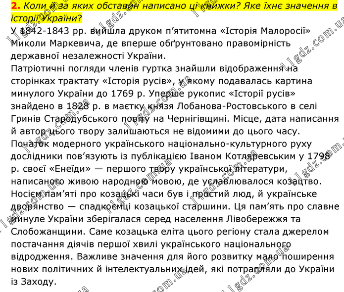 Коли й за яких обставин написано ці книжки? Яке їхнє значення в історії України? У 1842-1843 рр. вийшла друком п’ятитомна «Історія Малоросії» Миколи Маркевича, де вперше обґрунтовано правомірність державної незалежності України. Патріотичні погляди членів гуртка знайшли відображення на сторінках трактату «Історія русів», у якому подавалась картина минулого України до 1769 р. Уперше рукопис «Історії русів» знайдено в 1828 р. в маєтку князя Лобанова-Ростовського в селі Гринів Стародубського повіту на Чернігівщині. Місце, дата написання й автор цього твору залишаються не відомими до цього часу. Початок модерного українського національно-культурного руху дослідники пов’язують із публікацією Іваном Котляревським у 1798 р. своєї «Енеїди» — першого твору української літератури, написаного живою народною мовою, де уславлювалося козацтво. Носієм пам’яті про козацькі часи був і простий люд, й українське дворянство — спадкоємці козацької старшини. Ця пам’ять про славне минуле України зберігалася серед населення Лівобережжя та Слобожанщини. Саме козацька еліта цього регіону стала джерелом постачання діячів першої хвилі українського національного відродження. Важливе значення для його розвитку мало поширення нових політичних й інтелектуальних ідей, які потрапляли до України із Заходу.
