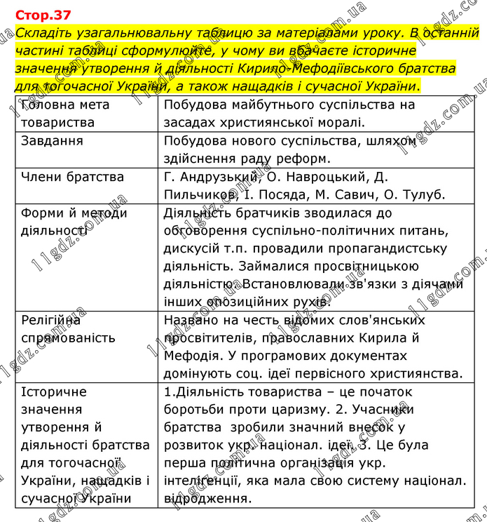 Складіть узагальнювальну таблицю за матеріалами уроку. В останній частині таблиці сформулюйте, у чому ви вбачаєте історичне значення утворення й діяльності Кирило-Мефодіївського братства для тогочасної України, а також нащадків і сучасної України. Головна мета товариства Побудова майбутнього суспільства на засадах християнської моралі. Завдання Побудова нового суспільства, шляхом здійснення раду реформ. Члени братства Г. Андрузький, О. Навроцький, Д. Пильчиков, І. Посяда, М. Савич, О. Тулуб. Форми й методи діяльності Діяльність братчиків зводилася до обговорення суспільно-політичних питань, дискусій т.п. провадили пропагандистську діяльність. Займалися просвітницькою діяльністю. Встановлювали зв'язки з діячами інших опозиційних рухів. Релігійна спрямованість Названо на честь відомих слов'янських просвітителів, православних Кирила й Мефодія. У програмових документах домінують соц. ідеї первісного християнства. Історичне значення утворення й діяльності братства для тогочасної' України, нащадків і сучасної України 1.Діяльність товариства – це початок боротьби проти царизму. 2. Учасники братства зробили значний внесок у розвиток укр. націонал. ідеї. 3. Це була перша політична організація укр. інтелігенції, яка мала свою систему націонал. відродження.