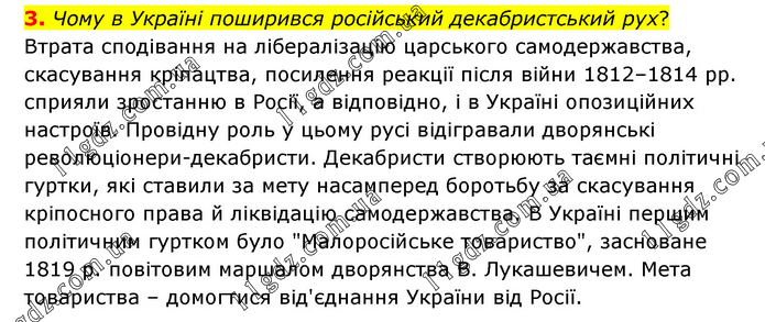 Чому в Україні поширився російський декабристський рух? Втрата сподівання на лібералізацію царського самодержавства, скасування кріпацтва, посилення реакції після війни 1812–1814 pp. сприяли зростанню в Росії, а відповідно, і в Україні опозиційних настроїв. Провідну роль у цьому русі відігравали дворянські революціонери-декабристи. Декабристи створюють таємні політичні гуртки, які ставили за мету насамперед боротьбу за скасування кріпосного права й ліквідацію самодержавства. В Україні першим політичним гуртком було "Малоросійське товариство", засноване 1819 р. повітовим маршалом дворянства В. Лукашевичем. Мета товариства – домогтися від'єднання України від Росії.