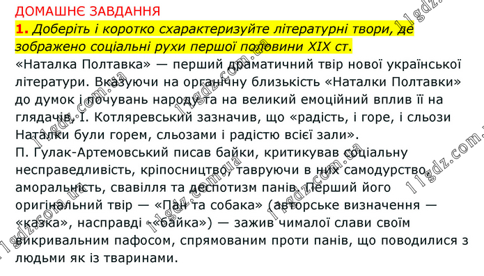 ДОМАШНЄ ЗАВДАННЯ 1. Доберіть і коротко схарактеризуйте літературні твори, де зображено соціальні рухи першої половини ХІХ ст. «Наталка Полтавка» — перший драматичний твір нової української літератури. Вказуючи на органічну близькість «Наталки Полтавки» до думок і почувань народу та на великий емоційний вплив її на глядачів, І. Котляревський зазначив, що «радість, і горе, і сльози Наталки були горем, сльозами і радістю всієї зали». П. Гулак-Артемовський писав байки, критикував соціальну несправедливість, кріпосництво, тавруючи в них самодурство, аморальність, свавілля та деспотизм панів. Перший його оригінальний твір — «Пан та собака» (авторське визначення — «казка», насправді -«байка») — зажив чималої слави своїм викривальним пафосом, спрямованим проти панів, що поводилися з людьми як із тваринами.