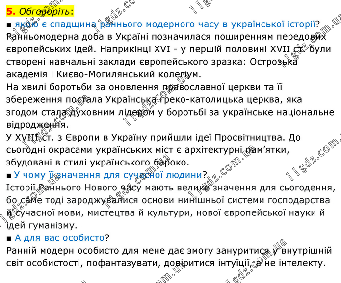Обговоріть: ■ якою є спадщина раннього модерного часу в української історії? Ранньомодерна доба в Україні позначилася поширенням передових європейських ідей. Наприкінці XVI - у першій половині XVII ст. були створені навчальні заклади європейського зразка: Острозька академія і Києво-Могилянський колегіум. На хвилі боротьби за оновлення православної церкви та її збереження постала Українська греко-католицька церква, яка згодом стала духовним лідером у боротьбі за українське національне відродження. У XVIII ст. з Європи в Україну прийшли ідеї Просвітництва. До сьогодні окрасами українських міст є архітектурні пам’ятки, збудовані в стилі українського бароко. ■ У чому її значення для сучасної людини? Історії Раннього Нового часу мають велике значення для сьогодення, бо саме тоді зароджувалися основи нинішньої системи господарства й сучасної мови, мистецтва й культури, нової європейської науки й ідей гуманізму. ■ А для вас особисто? Ранній модерн особисто для мене дає змогу зануритися у внутрішній світ особистості, пофантазувати, довіритися інтуїції, а не інтелекту.