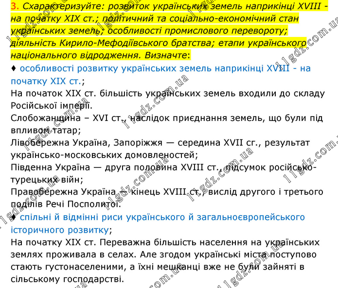 Схарактеризуйте: розвиток українських земель наприкінці XVIII - на початку XIX ст.; політичний та соціально-економічний стан українських земель; особливості промислового перевороту; діяльність Кирило-Мефодіївського братства; етапи українського національного відродження. Визначте: ♦ особливості розвитку українських земель наприкінці XVIII - на початку XIX ст.; На початок XIX ст. більшість українських земель входили до складу Російської імперії. Слобожанщина – XVI ст., наслідок приєднання земель, що були під впливом татар; Лівобережна Україна, Запоріжжя — середина XVII сг., результат українсько-московських домовленостей; Південна Україна — друга половина XVIII ст., підсумок російсько-турецьких війн; Правобережна Україна — кінець XVIII ст., вислід другого і третього поділів Речі Посполитої. ♦ спільні й відмінні риси українського й загальноєвропейського історичного розвитку; На початку XIX ст. Переважна більшість населення на українських землях проживала в селах. Але згодом українські міста поступово стають густонаселеними, а їхні мешканці вже не були зайняті в сільському господарстві.