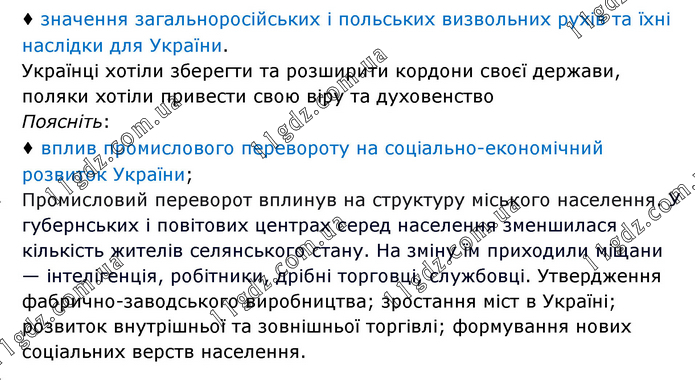 ♦ значення загальноросійських і польських визвольних рухів та їхні наслідки для України. Українці хотіли зберегти та розширити кордони своєї держави, поляки хотіли привести свою віру та духовенство Поясніть: ♦ вплив промислового перевороту на соціально-економічний розвиток України; • Промисловий переворот вплинув на структуру міського населення. У губернських і повітових центрах серед населення зменшилася кількість жителів селянського стану. На зміну їм приходили міщани — інтелігенція, робітники, дрібні торговці, службовці. Утвердження фабрично-заводського виробництва; зростання міст в Україні; розвиток внутрішньої та зовнішньої торгівлі; формування нових соціальних верств населення.