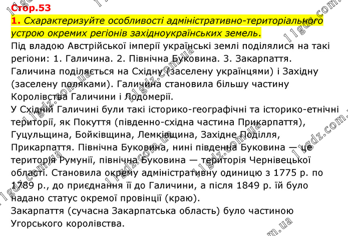 1. Схарактеризуйте особливості адміністративно-територіального устрою окремих регіонів західноукраїнських земель. Під владою Австрійської імперії українські землі поділялися на такі регіони: 1. Галичина. 2. Північна Буковина. 3. Закарпаття. Галичина поділяється на Східну (заселену українцями) і Західну (заселену поляками). Галичина становила більшу частину Королівства Галичини і Лодомерії. У Східній Галичині були такі історико-географічні та історико-етнічні території, як Покуття (південно-східна частина Прикарпаття), Гуцульщина, Бойківщина, Лемківщина, Західне Поділля, Прикарпаття. Північна Буковина, нині південна Буковина — це територія Румунії, північна Буковина — територія Чернівецької області. Становила окрему адміністративну одиницю з 1775 р. по 1789 р., до приєднання її до Галичини, а після 1849 р. їй було надано статус окремої провінції (краю). Закарпаття (сучасна Закарпатська область) було частиною Угорського королівства.