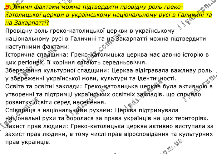 Якими фактами можна підтвердити провідну роль греко-католицької церкви в українському національному русі в Галичині та на Закарпатті? Провідну роль греко-католицької церкви в українському національному русі в Галичині та на Закарпатті можна підтвердити наступними фактами: Історична спадщина: Греко-католицька церква має давню історію в цих регіонах, її коріння сягають середньовіччя. Збереження культурної спадщини: Церква відігравала важливу роль у збереженні української мови, культури та ідентичності. Освіта та освітні заклади: Греко-католицька церква була активною в утворенні та підтримці українських освітніх закладів, що сприяло розвитку освіти серед населення. Співпраця з національними рухами: Церква підтримувала національні рухи та боролася за права українців на цих територіях. Захист прав людини: Греко-католицька церква активно виступала за захист прав людини, в тому числі прав віросповідання та культурних прав українців.