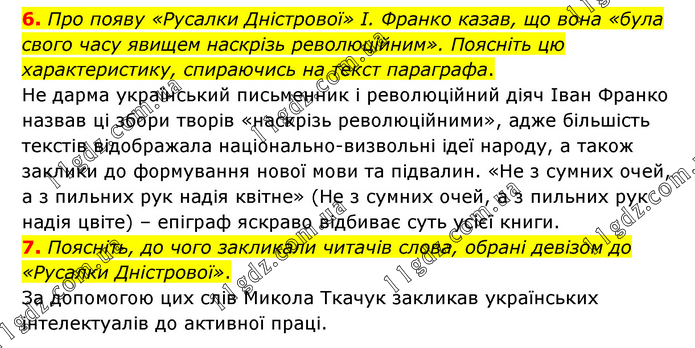 6. Про появу «Русалки Дністрової» І. Франко казав, що вона «була свого часу явищем наскрізь революційним». Поясніть цю характеристику, спираючись на текст параграфа. Не дарма український письменник і революційний діяч Іван Франко назвав ці збори творів «наскрізь революційними», адже більшість текстів відображала національно-визвольні ідеї народу, а також заклики до формування нової мови та підвалин. «Не з сумних очей, а з пильних рук надія квітне» (Не з сумних очей, а з пильних рук надія цвіте) – епіграф яскраво відбиває суть усієї книги. 7. Поясніть, до чого закликали читачів слова, обрані девізом до «Русалки Дністрової». За допомогою цих слів Микола Ткачук закликав українських інтелектуалів до активної праці.
