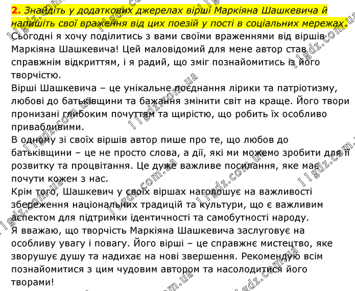 Знайдіть у додаткових джерелах вірші Маркіяна Шашкевича й напишіть свої враження від цих поезій у пості в соціальних мережах. Сьогодні я хочу поділитись з вами своїми враженнями від віршів Маркіяна Шашкевича! Цей маловідомий для мене автор став справжнім відкриттям, і я радий, що зміг познайомитись із його творчістю. Вірші Шашкевича – це унікальне поєднання лірики та патріотизму, любові до батьківщини та бажання змінити світ на краще. Його твори пронизані глибоким почуттям та щирістю, що робить їх особливо привабливими. В одному зі своїх віршів автор пише про те, що любов до батьківщини – це не просто слова, а дії, які ми можемо зробити для її розвитку та процвітання. Це дуже важливе посилання, яке має почути кожен з нас. Крім того, Шашкевич у своїх віршах наголошує на важливості збереження національних традицій та культури, що є важливим аспектом для підтримки ідентичності та самобутності народу. Я вважаю, що творчість Маркіяна Шашкевича заслуговує на особливу увагу і повагу. Його вірші – це справжнє мистецтво, яке зворушує душу та надихає на нові звершення. Рекомендую всім познайомитися з цим чудовим автором та насолодитися його творами!