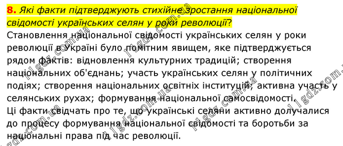 Які факти підтверджують стихійне зростання національної свідомості українських селян у роки революції? Становлення національної свідомості українських селян у роки революції в Україні було помітним явищем, яке підтверджується рядом фактів: відновлення культурних традицій; створення національних об'єднань; участь українських селян у політичних подіях; створення національних освітніх інституцій; активна участь у селянських рухах; формування національної самосвідомості. Ці факти свідчать про те, що українські селяни активно долучалися до процесу формування національної свідомості та боротьби за національні права під час революції.