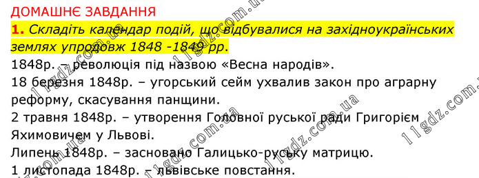 ДОМАШНЄ ЗАВДАННЯ 1. Складіть календар подій, що відбувалися на західноукраїнських землях упродовж 1848 -1849 рр. 1848р. – революція під назвою «Весна народів». 18 березня 1848р. – угорський сейм ухвалив закон про аграрну реформу, скасування панщини. 2 травня 1848р. – утворення Головної руської ради Григорієм Яхимовичем у Львові. Липень 1848р. – засновано Галицько-руську матрицю. 1 листопада 1848р. – львівське повстання.