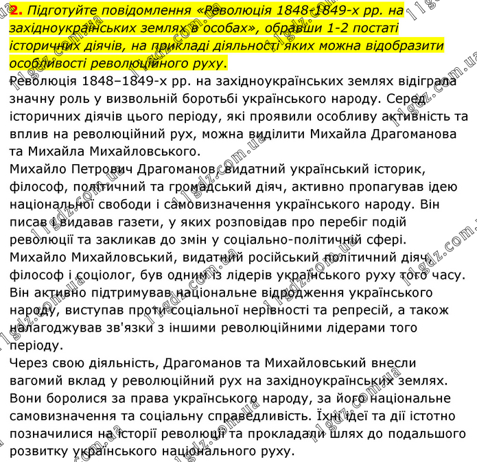 2. Підготуйте повідомлення «Революція 1848-1849-х рр. на західноукраїнських землях в особах», обравши 1-2 постаті історичних діячів, на прикладі діяльності яких можна відобразити особливості революційного руху. Революція 1848–1849-х рр. на західноукраїнських землях відіграла значну роль у визвольній боротьбі українського народу. Серед історичних діячів цього періоду, які проявили особливу активність та вплив на революційний рух, можна виділити Михайла Драгоманова та Михайла Михайловського. Михайло Петрович Драгоманов, видатний український історик, філософ, політичний та громадський діяч, активно пропагував ідею національної свободи і самовизначення українського народу. Він писав і видавав газети, у яких розповідав про перебіг подій революції та закликав до змін у соціально-політичній сфері. Михайло Михайловський, видатний російський політичний діяч, філософ і соціолог, був одним із лідерів українського руху того часу. Він активно підтримував національне відродження українського народу, виступав проти соціальної нерівності та репресій, а також налагоджував зв'язки з іншими революційними лідерами того періоду. Через свою діяльність, Драгоманов та Михайловський внесли вагомий вклад у революційний рух на західноукраїнських землях. Вони боролися за права українського народу, за його національне самовизначення та соціальну справедливість. Їхні ідеї та дії істотно позначилися на історії революції та прокладали шлях до подальшого розвитку українського національного руху.