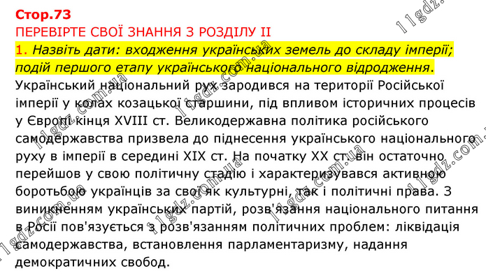 ПЕРЕВІРТЕ СВОЇ ЗНАННЯ З РОЗДІЛУ ІІ 1. Назвіть дати: входження українських земель до складу імперії; подій першого етапу українського національного відродження. Український національний рух зародився на території Російської імперії у колах козацької старшини, під впливом історичних процесів у Європі кінця XVIII ст. Великодержавна політика російського самодержавства призвела до піднесення українського національного руху в імперії в середині XIX ст. На початку XX ст. він остаточно перейшов у свою політичну стадію і характеризувався активною боротьбою українців за свої як культурні, так і політичні права. З виникненням українських партій, розв'язання національного питання в Росії пов'язується з розв'язанням політичних проблем: ліквідація самодержавства, встановлення парламентаризму, надання демократичних свобод.