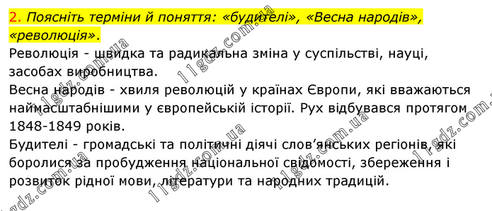 Поясніть терміни й поняття: «будителі», «Весна народів», «революція». Революція - швидка та радикальна зміна у суспільстві, науці, засобах виробництва. Весна народів - хвиля революцій у країнах Європи, які вважаються наймасштабнішими у європейській історії. Рух відбувався протягом 1848-1849 років. Будителі - громадські та політичні діячі слов’янських регіонів, які боролися за пробудження національної свідомості, збереження і розвиток рідної мови, літератури та народних традицій.
