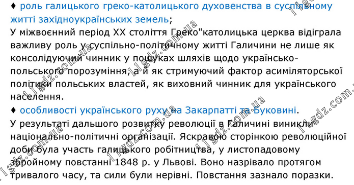 ♦ роль галицького греко-католицького духовенства в суспільному житті західноукраїнських земель; У міжвоєнний період ХХ століття Греко"католицька церква відіграла важливу роль у суспільно-політичному житті Галичини не лише як консолідуючий чинник у пошуках шляхів щодо українсько-польського порозуміння, а й як стримуючий фактор асиміляторської політики польських властей, як виховний чинник для українського населення. ♦ особливості українського руху на Закарпатті та Буковині. У результаті дальшого розвитку революції в Галичині виникли національно-політичні організації. Яскравою сторінкою революційної доби була участь галицького робітництва, у листопадовому збройному повстанні 1848 р. у Львові. Воно назрівало протягом тривалого часу, та сили були нерівні. Повстання зазнало поразки.