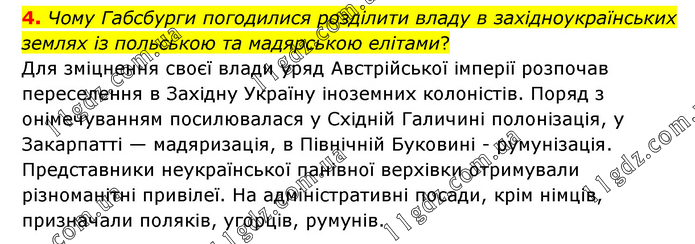Чому Габсбурги погодилися розділити владу в західноукраїнських землях із польською та мадярською елітами? Для зміцнення своєї влади уряд Австрійської імперії розпочав переселення в Західну Україну іноземних колоністів. Поряд з онімечуванням посилювалася у Східній Галичині полонізація, у Закарпатті — мадяризація, в Північній Буковині - румунізація. Представники неукраїнської панівної верхівки отримували різноманітні привілеї. На адміністративні посади, крім німців, призначали поляків, угорців, румунів.