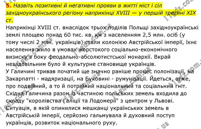 Назвіть позитивні й негативні прояви в житті міст і сіл західноукраїнського регіону наприкінці XVIII — у першій третині ХІХ ст. Наприкінці XVIII ст. внаслідок трьох поділів Польщі західноукраїнські землі площею понад 60 тис. кв. км з населенням 2,5 млн. осіб (у тому числі 2 млн. українців) стали колонією Австрійської імперії, їхнє населення жило в умовах жорстокого соціально-економічного визиску з боку феодально-абсолютистської монархії. Вкрай незадовільним було й культурне становище українців. У Галичині тривав початий ще значно раніше процес полонізації, на Закарпатті - мадяризації, на Буковині - румунізації. Йдеться, отже, про подвійний, а то й потрійний національний та соціальний гніт. Східна Галичина разом із частиною польських земель входила до складу "королівства Галіції та Лодомерії" з центром у Львові. Ситуація, в якій опинилися мешканці українських земель в Австрійській імперії, серйозно гальмувала й духовний поступ українців, розвиток національного руху.