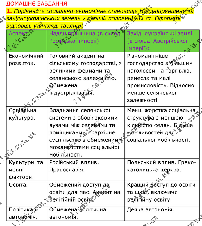 ДОМАШНЄ ЗАВДАННЯ 1. Порівняйте соціально-економічне становище Наддніпрянщини та західноукраїнських земель у першій половині XIX ст. Оформіть відповідь у вигляді таблиці. Аспект Наддніпрянщина (в складі Російської імперії) Західноукраїнські землі (в складі Австрійської імперії): Економічний розвиток. Головний акцент на сільському господарстві, з великими фермами та селянською залежністю. Обмежена індустріалізація. Різноманітніше господарство з більшим наголосом на торгівлю, ремесла та малі промисловість. Відносно менше селянської залежності. Соціальна культура. Владнання селянської системи з обов'язковими вузами між селянами та поміщиками. Ієрархічне суспільство з обмеженими можливостями соціальної мобільності. Менш жорстка соціальна структура з меншею кількістю селян. Більше можливостей для соціальної мобільності. Культурні та мовні фактори. Російський вплив. Православ'я. Польський вплив. Греко-католицька церква. Освіта. Обмежений доступ до освіти для мас. Акцент на релігійній освіті. Кращий доступ до освіти та шкіл, включачи релігійну освіту. Політика і автономія. Обмежена політична автономія. Деяка автономія.
