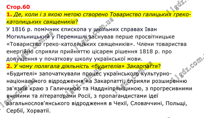 1. Де, коли і з якою метою створено Товариство галицьких греко-католицьких священиків? У 1816 р. помічник єпископа у шкільних справах Іван Могильницький у Перемишлі заснував перше просвітницьке «Товариство греко-католицьких священиків». Члени товариства енергійно сприяли прийняттю цісарем рішення 1818 р. про допущення у початкову школу української мови. 2. У чому полягала діяльність «будителів» Закарпаття? «Будителі» започаткували процес українського культурно-національного відродження на Закарпатті, сприяли розширенню зв'язків краю з Галичиною та Наддніпрянщиною, з прогресивними вченими та літераторами Росії, з пропагандистами ідеї загальнослов'янського відродження в Чехії, Словаччині, Польщі, Сербії, Хорватії.